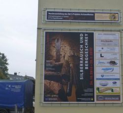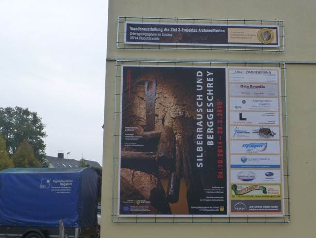 Herr Oberbürgermeister Jens Peter, Frau Andrea Dombrois, Vizepräsidentin des Landestages Dresden sowie Frau Dr. Christiane Hemker, Frau Wendy Eixler und Frau Jitka Hrichkova vom ArchaeoMontan – Projekt vom Landesamt für Archäologie Sachsen haben sich die Zeit genommen, um gemeinsam mit dem „Förderverein mittelalterlicher Bergbau Dippoldiswalde e.V.“ auf die feierlich Enthüllung des Werbeplakates mit einem Gläschen Sekt anzustoßen. Es ist der erste Hinweis auf ein großes Ereignis: die Wanderausstellung zu dem mittelalterlichen Bergbau in Dippoldiswalde. Dieses Werbeplakat wurde von dem „Förderverein mittelalterlicher Bergbau Dippoldiswalde e.V.“, mit der Unterstützung von Sponsoren, auf den Weg gebracht. Weitere Werbeaktionen und Plakatierungen werden folgen, so die Aussage von Wendy Eixler vom Ziel-3 Projekt des Landesamtes für Archäologie Sachsen.