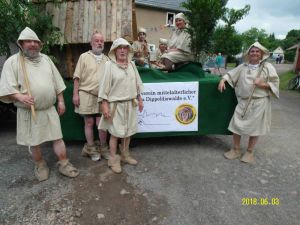 Vor über 800 Jahren gehörten auch die Bergleute zu den ersten Siedlern von Dippoldiswalde. Dem entsprechend gestaltete unser Verein beim Festumzug eines der ersten Bilder. Die wahrscheinlich damalige Kleidung der Bergleute, die Gugeln, wurden in Eigeniniative von Andrea Kretschmann in zeitaufwendiger Arbeit genäht. Dazu passte aber auch das Gesamtbild mit dem "fahrbaren" Grubenhaus und der "Bergmannsfamilie" für diese nachgestellte Periode, genauso die vor uns fahrende Bierkutsche, die den Bierstreit mit Freiberg zu dieser Zeit symbolisierte. Den Gästen am Straßenrand und uns war es aber an diesem heißen Tag egal, dass das Bier diesmal aus Freiberg kam. Viele Besucher (ca. 7. 000) an der Umzugstrecke, so u.a. auch der Ministerpräsident Herr Kretschmer und der Landrat Herr Geisler begrüßten uns mit einem herzlichem "Glück Auf ".